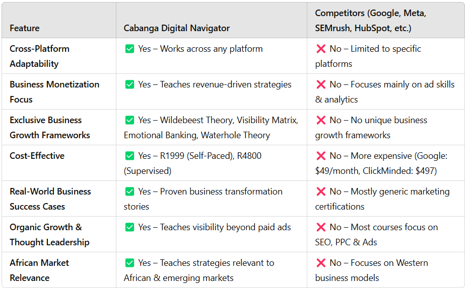 Digital Navigator Company helps you and your business grow through practical training and consulting that teach the trade of digital marketing – not just the tools. Our flagship program, the Cabanga Digital Navigator Certification, equips individuals and teams to plan, execute, and scale visibility that lasts. Alongside it, we offer specialized short courses and consulting to help businesses apply what they learn in real markets.